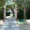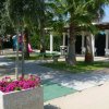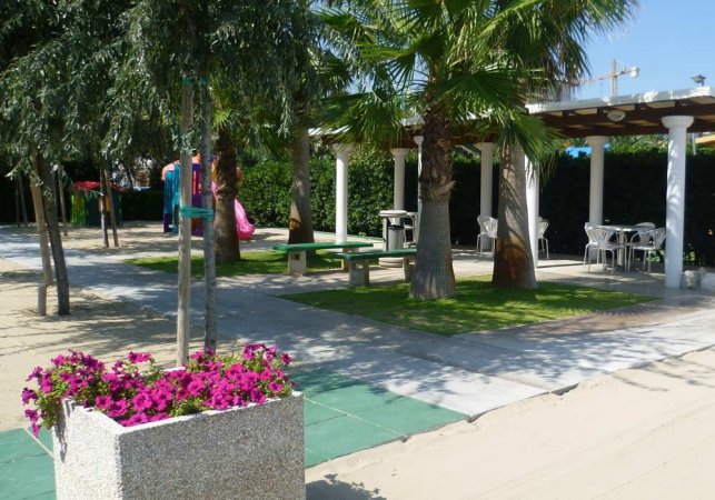 Spazio all'aperto con palme, area giochi e viali.